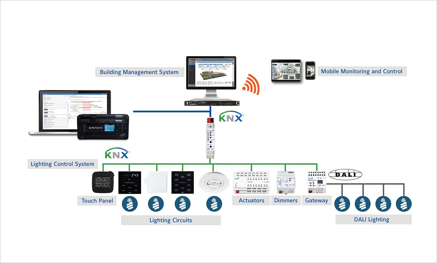 Johnson Controls BMS integra i dispositivi del sistema di controllo dell'illuminazione utilizzando KNX, BACnet e DALI.